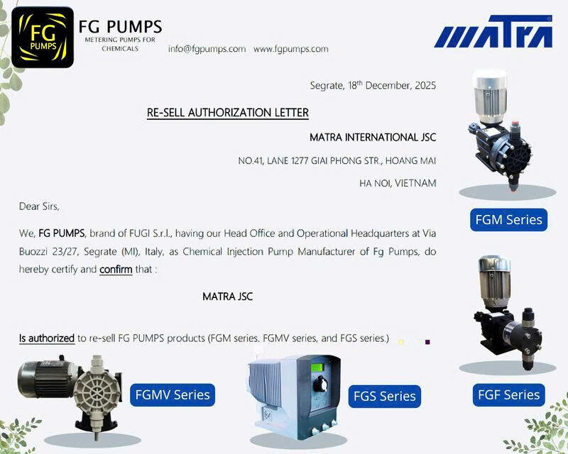 CÔNG TY CỔ PHẦN MATRA QUỐC TẾ (Matra JSC) là đơn vị chính thức được ủy quyền phân phối và tư vấn kỹ thuật các dòng bơm định lượng của FG Pumps tại thị trường Việt Nam. Theo ủy quyền ngày 18/12/2025